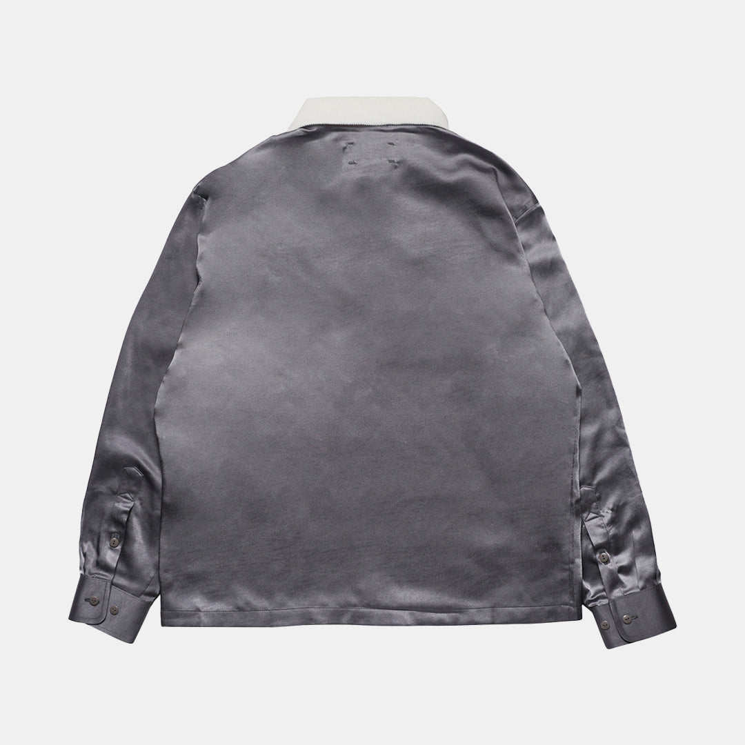 Subtle sheen with a half-zip placket and contrast collar; softstructure, easy drape.